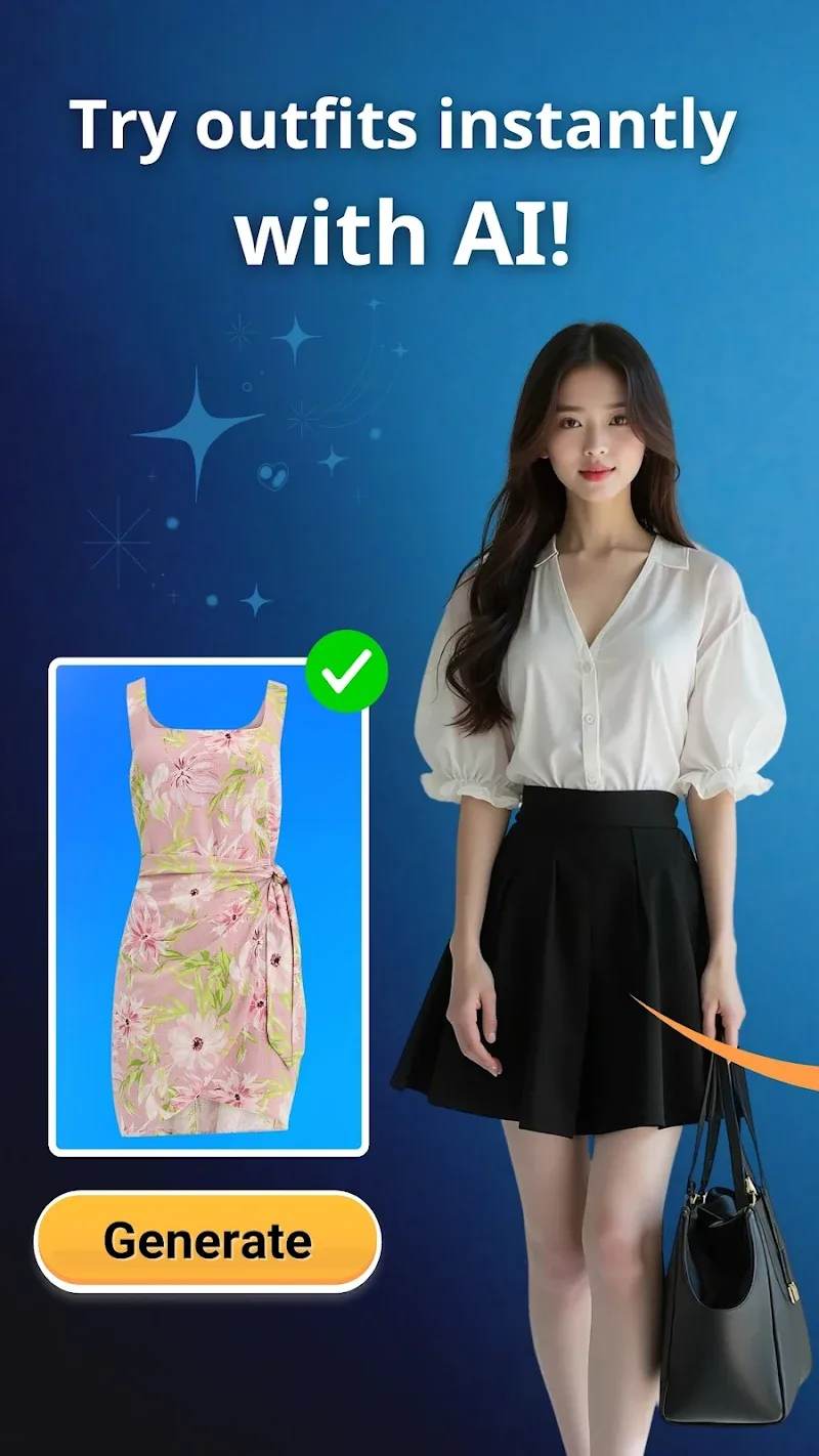 Приложение приносит вам чрезвычайно интеллектуальную систему преобразования на основе ИИ. С этой системой вы можете быстро выбирать одежду, не сталкиваясь с какими-либо трудностями.
