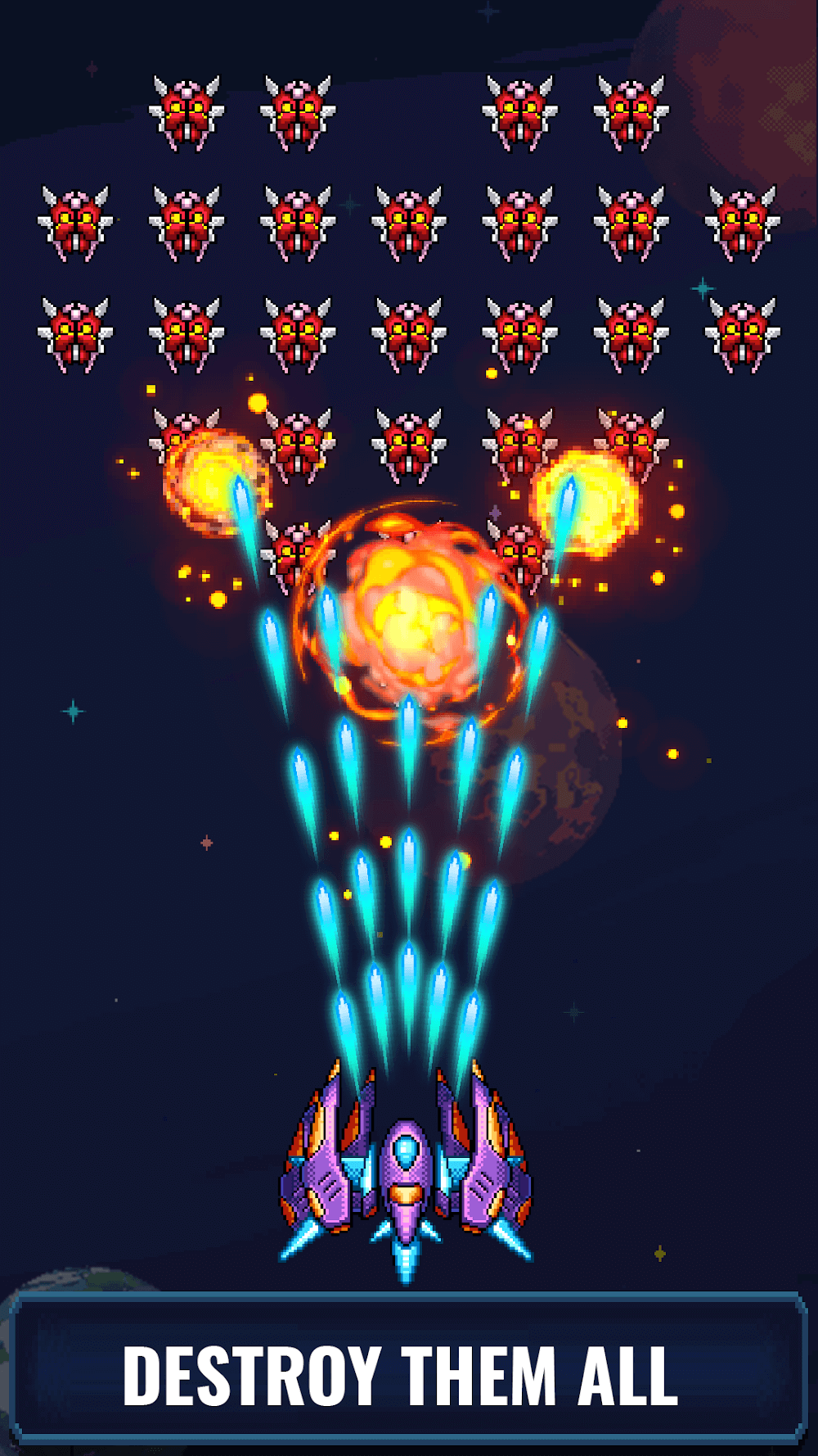 Касайтесь экрана пальцем и направляйте свой космический корабль в любом направлении, чтобы избежать уничтожения вражеским огнём, одновременно отвечая противникам. Сражаясь с любыми пришельцами, вам нужно накопить как можно больше силы, чтобы обрушить разрушительную атаку, даже уклоняясь от неизбежных атак благодаря отличному восприятию. Кроме того, управление постоянно улучшается по мере вашего прогресса, и вы можете выполнять больше действий для более плавного боя и отправки захватчиков обратно в ад.