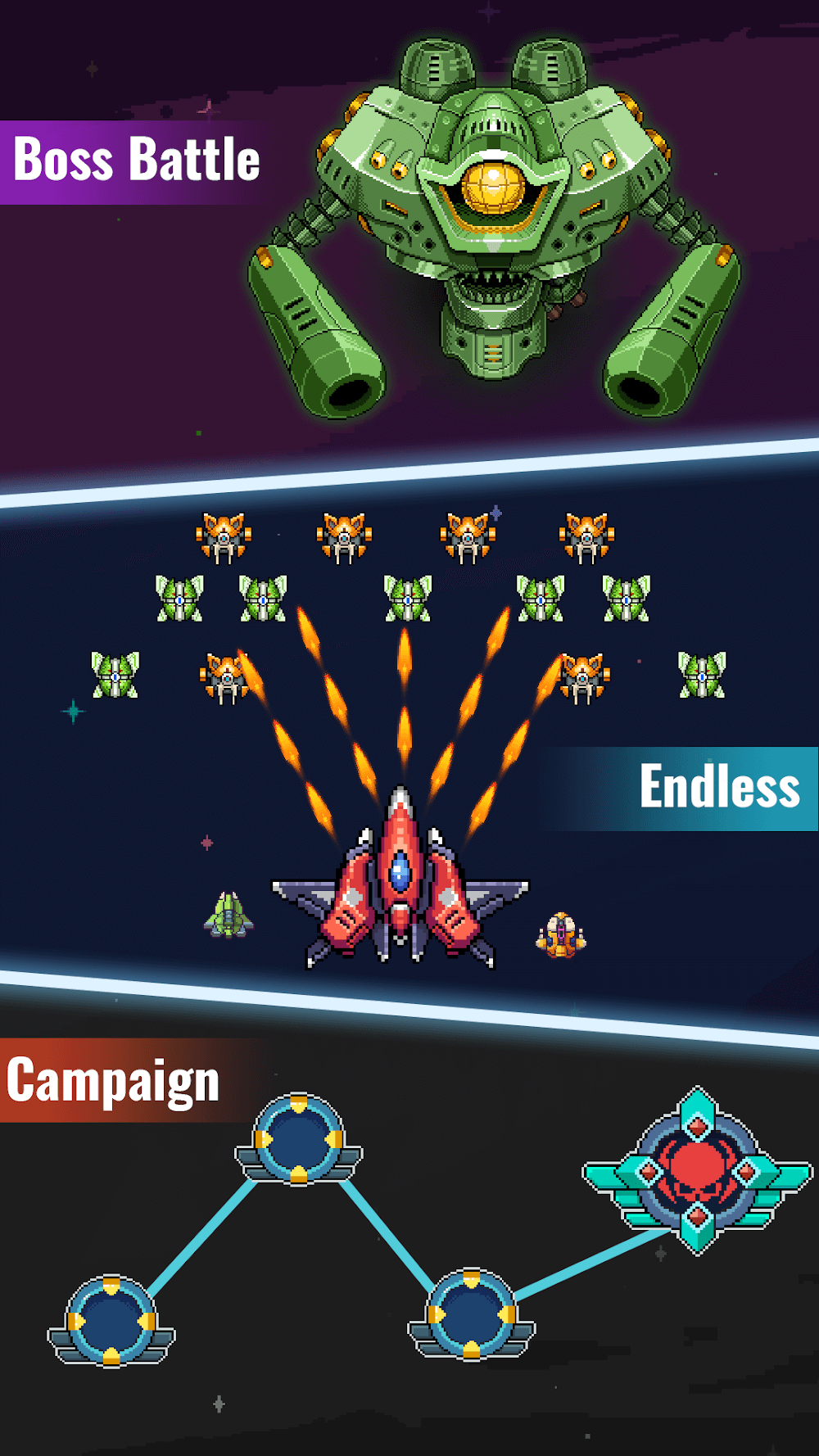 В игре около 80 офлайн-этапов, каждый из которых заполнен враждебными инопланетными захватчиками и мощными боссами, готовыми захватить мир, и вы должны положить конец их коварству. Три уровня сложности прогрессируют от лёгкого до очень сложного, и их можно настроить под предпочитаемый стиль игры. Более того, в игре есть более увлекательные игровые опции, такие как игра и изучение ваших любимых галактических шутеров в различных режимах, включая «Бесконечный», «Турнир» и другие.
