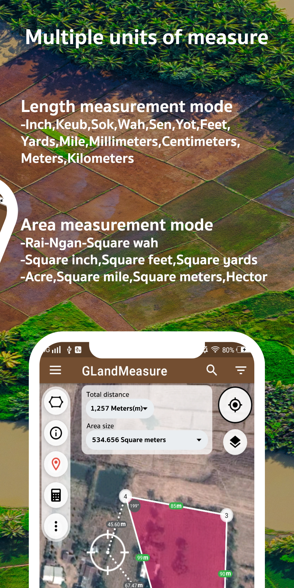 Измерение длины/расстояния и площади земли — это две из множества полезных опций измерений, которые предоставляет GLandMeasure. В зависимости от ваших потребностей, вы можете либо обойти участок пешком, либо использовать метод касаний на экране мобильного устройства. Благодаря такой адаптивности вы можете легко и точно измерять участки любого размера. Покончите со стрессом из-за перевода единиц измерения. Доступен широкий спектр единиц измерения длины и площади. Доступно несколько единиц, от тайского ваха и ворка до английского дюйма, фута и мили, а также метрических миллиметра, метра и гектара.