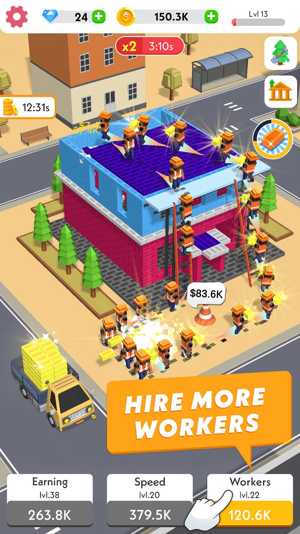 - Наём и обучение рабочих: Игроки могут нанимать рабочих в свою строительную команду и обучать их, чтобы они строили эффективнее, зарабатывали больше денег и строили быстрее.