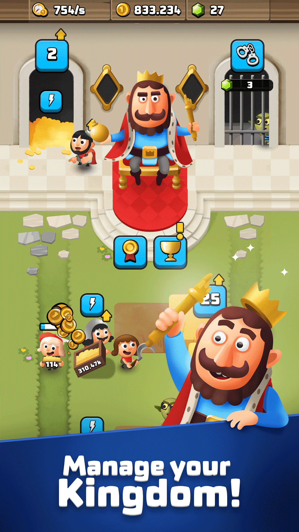 В King Royale: Idle Tycoon вы будете управлять королевством и сможете определять его будущее. Вы можете отдавать приказы и контролировать своих подчинённых для выполнения различных задач, таких как сбор ресурсов, захват пленников, завоевания и т.д. Кроме того, игроки могут заниматься деятельностью, связанной со сбором ресурсов, чтобы увеличить количество активов, доступных их королевству. Более того, вы можете отправлять подчинённых в регионы для добычи таких ресурсов, как еда, минералы и другие полезные ресурсы. Без помощи финансовых ресурсов расширение вашего королевства невозможно. Следовательно, вы должны собрать как можно больше ресурсов, а затем продать их, чтобы увеличить количество денег, доступных вам для развития королевства.