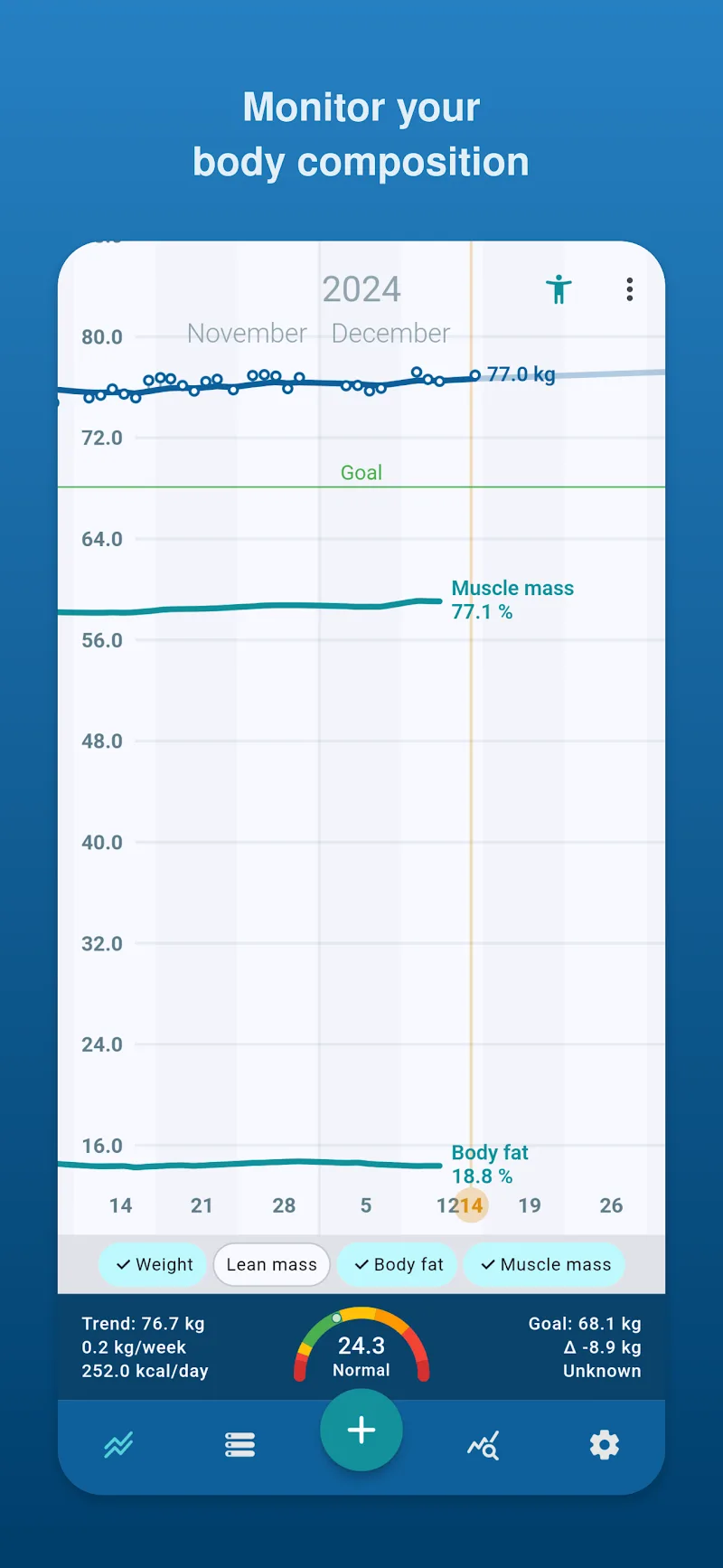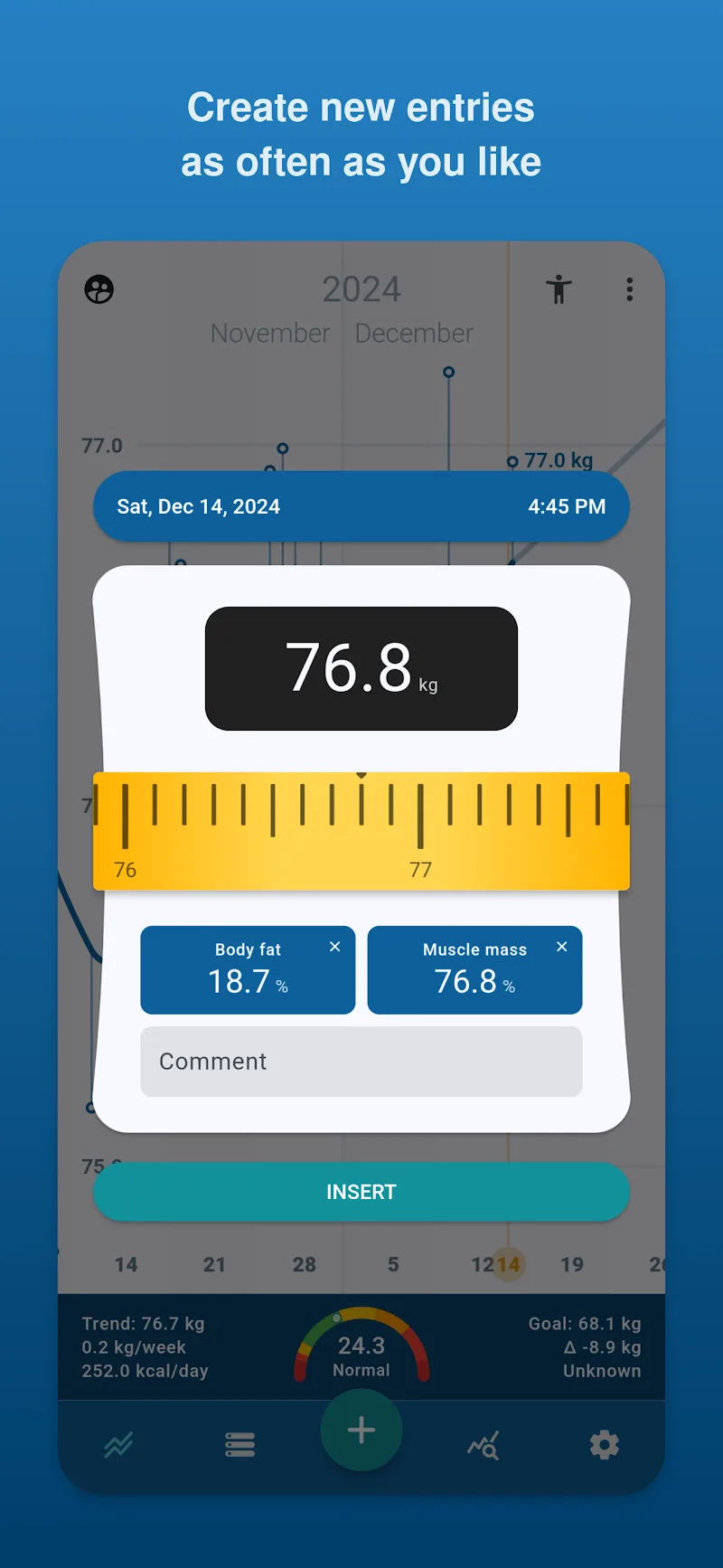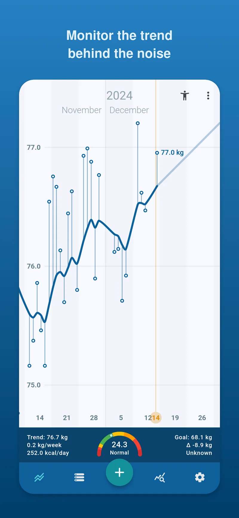 Снижение веса часто не является простым процессом, оно требует соблюдения определённых правил. Таким образом, приложение станет идеальным инструментом для отслеживания ваших показателей.