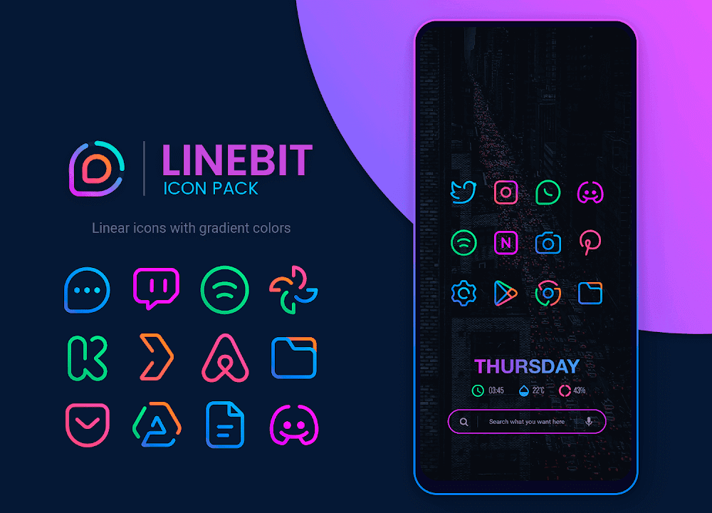 Вы давно не обновляли внешний вид своего телефона. Вам стоит установить Linebit на свой телефон и по этой причине ежедневно обновлять свой внешний вид. С более чем 4000 значков, созданных нашей программой, вы можете свободно менять значки на своём телефоне. Если точнее, в их дизайне присутствуют яркие неоновые эффекты.