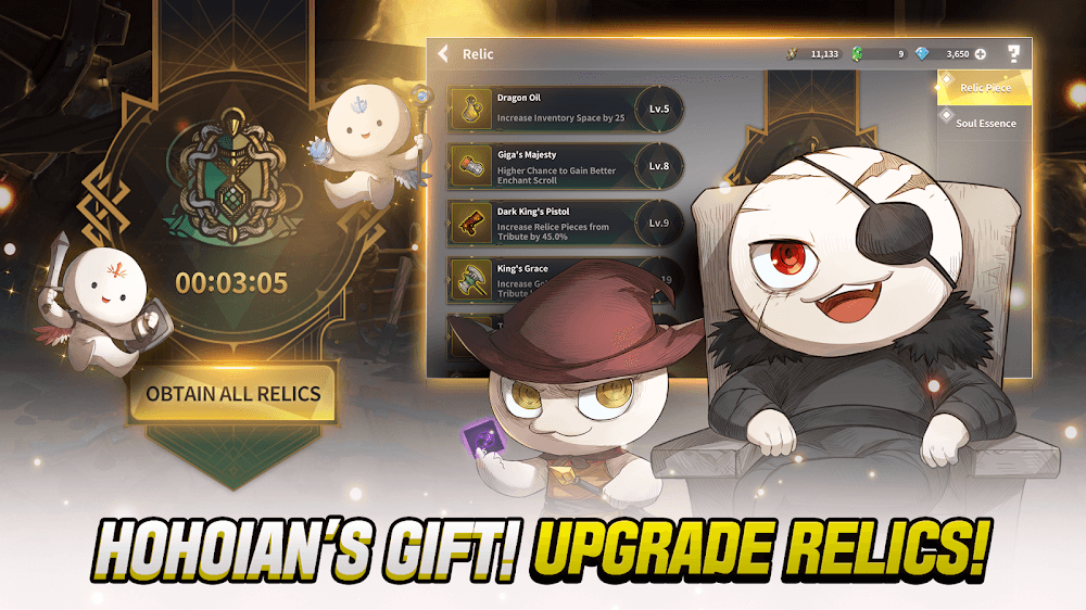 Отдайте дань уважения Деревне Тьмы и «Реликвии Бога», которую она хранит. Необходимо собирать ресурсы, генерируемые, пока герои отдыхают, чтобы обеспечить им преимущество. Реликвии оказывают различное влияние и усиливают героев. Вы можете выбрать любые реликвии и наделить ими нужных героев, чтобы увеличить их силу. В игре представлено бесконечное количество реликвий со случайными характеристиками, и вы можете почтить соответствующих богов.