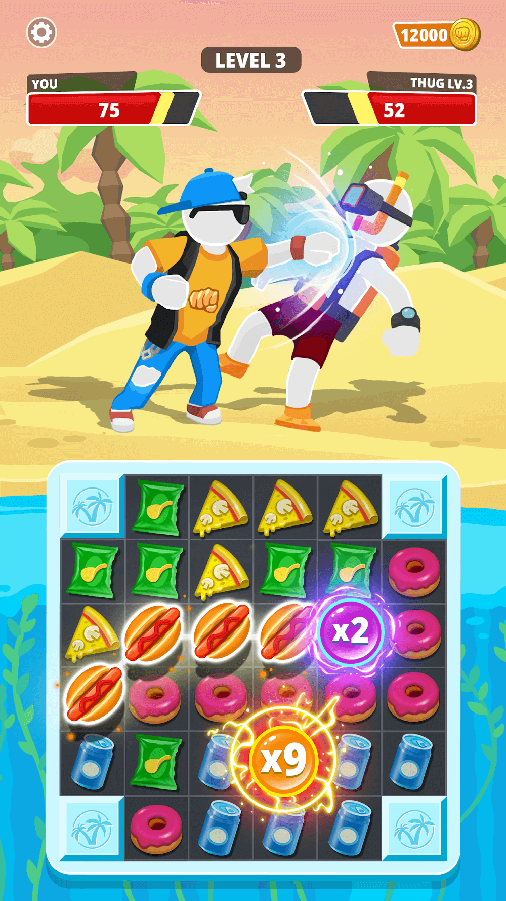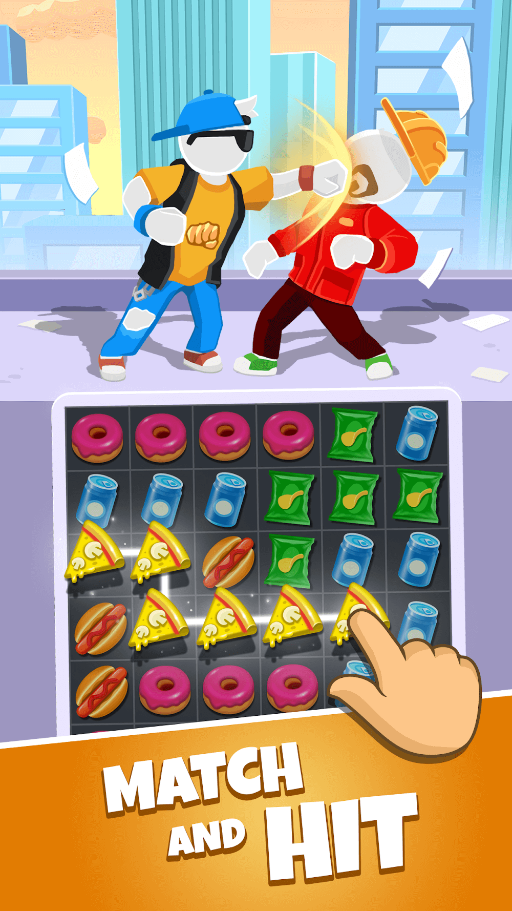 Match Hit: Puzzle Fighter; в этой игре, как игрок, вы должны решать все головоломки, разблокировать новых бойцов и, используя различное оружие, побеждать врагов. Игра случайным образом показывает внизу экрана головоломку, и, играя неизвестно что, вы должны атаковать врагов с помощью суперспособностей. Чтобы победить врагов, сначала вы должны сопоставить пищевые продукты, съесть их, набрать энергию, а затем атаковать и победить их. Побеждая врагов, вы можете зарабатывать монеты. В этой игре-головоломке на сопоставление и удар вам следует избегать соединения вредных продуктов. Если вы сопоставите более одного вида вредной еды, игра станет для вас сложнее. В этой игре вы должны поглощать цепочки бургеров, пончиков, хот-догов и картофельных чипсов, чтобы зарядить свои удары естественной силой и участвовать в различных испытаниях.