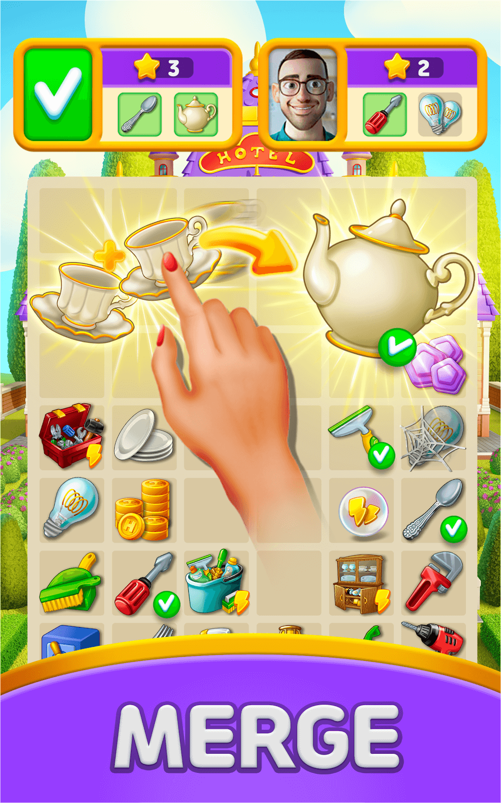 Merge Hotel — это больше, чем предполагает её название. Это основа для того, чтобы перейти на более привлекательную позицию. Она создана, чтобы отель выглядел великолепно. Ваше творчество и чувство прекрасного найдут здесь хорошее применение. Максимально используйте свою способность произвести впечатление на босса. Вы можете сразу начать украшать предметами, полученными в игре на слияние. При удаче вы сможете превратить обычный отель в самый красивый в округе. Оформление отеля должно соответствовать возрасту и тематике мероприятия. Нельзя украсить отель к Рождеству без таких вещей, как рождественская ёлка, подарочные коробки и малиновые шторы.