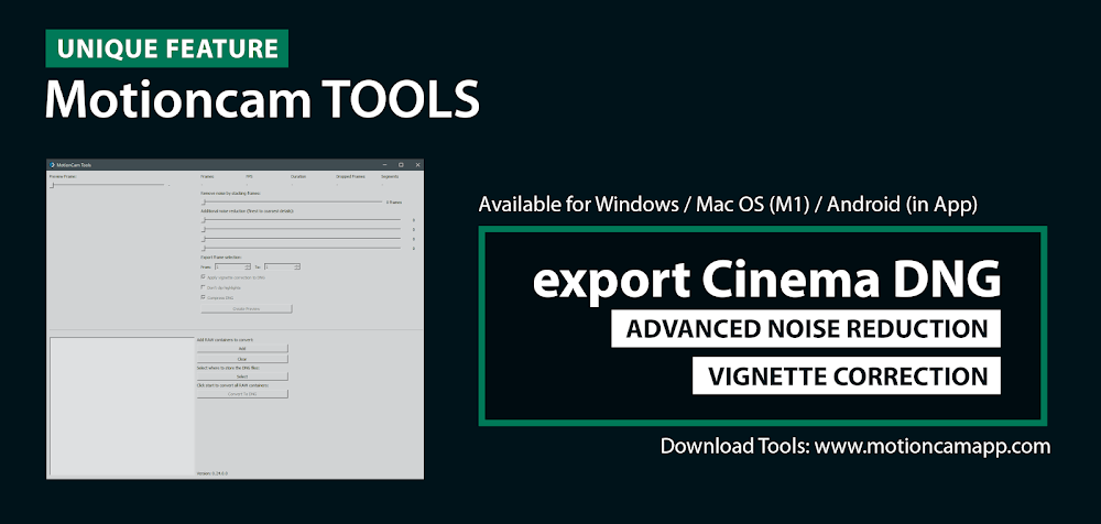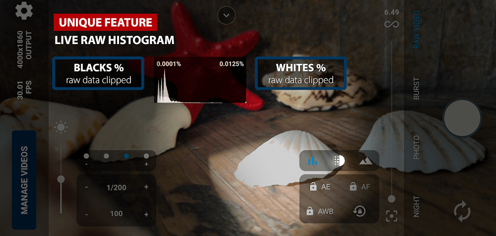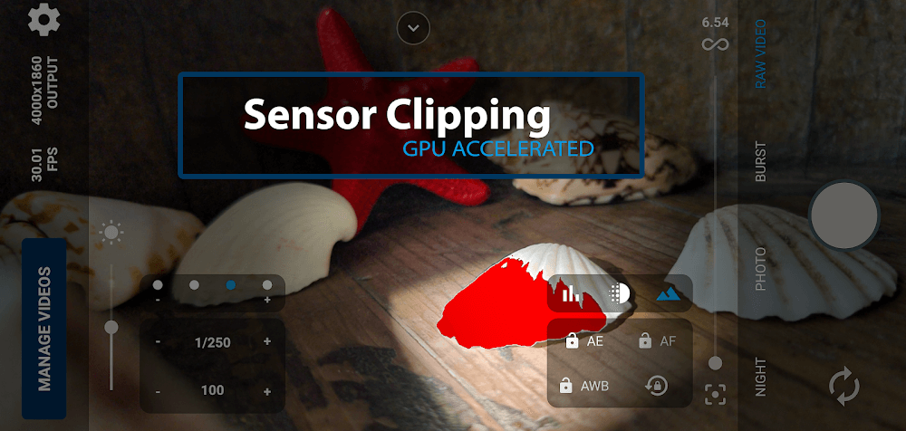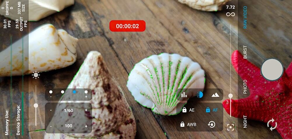 Запись необработанных изображений в течение некоторого времени вместе с данными гироскопа, чтобы их можно было позже использовать в приложении Gyroflow для лучшей стабилизации. Тепловая карта также показывает области внутри контейнера MCRAW, из которых кадры выпадают из видеопотока. Возможна запись видео с любой частотой кадров от 1 до 480 кадров в секунду, что позволяет создавать различные эффекты замедленной съёмки. У вас есть полный контроль над экспозицией благодаря ручному режиму с настройками «коснуться для экспозиции» и блокировкой экспозиции. Гистограмма генерируется в реальном времени на основе необработанных исходных данных. Пикинг фокуса полезен при ручной фокусировке камеры. Света и тени извлекаются с сенсора и обрезаются.