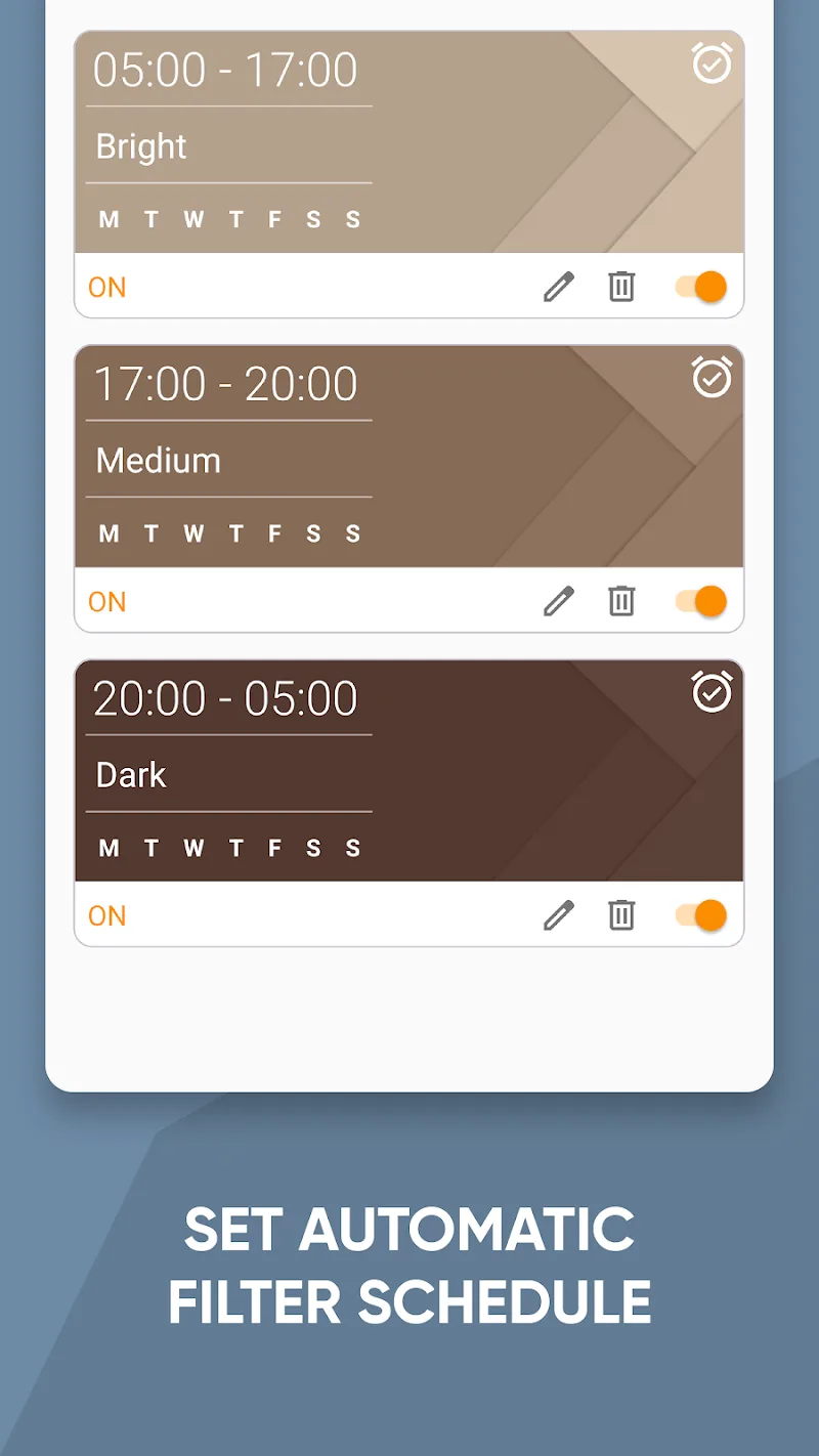 - Этот набор приложений имеет встроенную функцию, которая автоматически активирует ночной режим или красный свет и убирает синий свет.