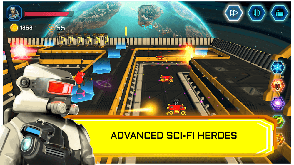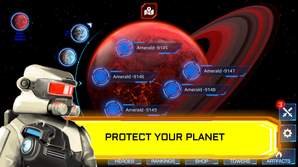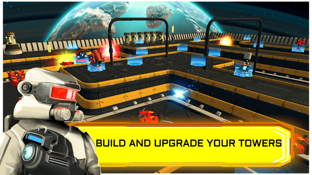 Вы — главный герой, спасающий Планету от врагов. Вы можете построить столько башен, сколько захотите, и использовать мощные виды вооружения, такие как Дизраптер, Пушка, Плазма, ПВО, Миномёт, Тесла, Дробовик, Соник, Ракета и т.д. Каждое оружие обладает атрибутами, такими как Атака, Скорость и Дальность, и при необходимости можно добавлять Артефакты. Вы можете улучшать эти виды оружия, увеличивая силу их атрибутов. Например, Пушка может наносить 90-100 урона за одну атаку со скоростью и дальностью 0.40 и 15.00 соответственно, и можно улучшить атаку до 200 или скорость до 0.60 и т.д. Точно так же вы можете улучшать другие научно-фантастические виды вооружения, если получите больше алмазов.