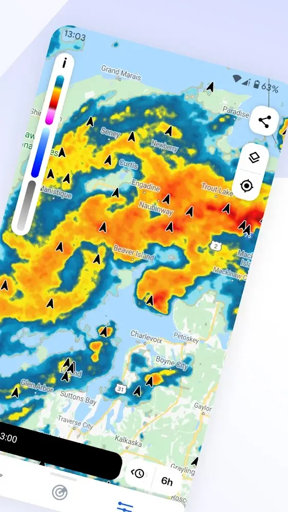 - Живой анимированный радар: На основе карты, предоставляемой приложением, вы можете узнавать о многих типах дождя, среднем количестве осадков и снеге в реальном времени.