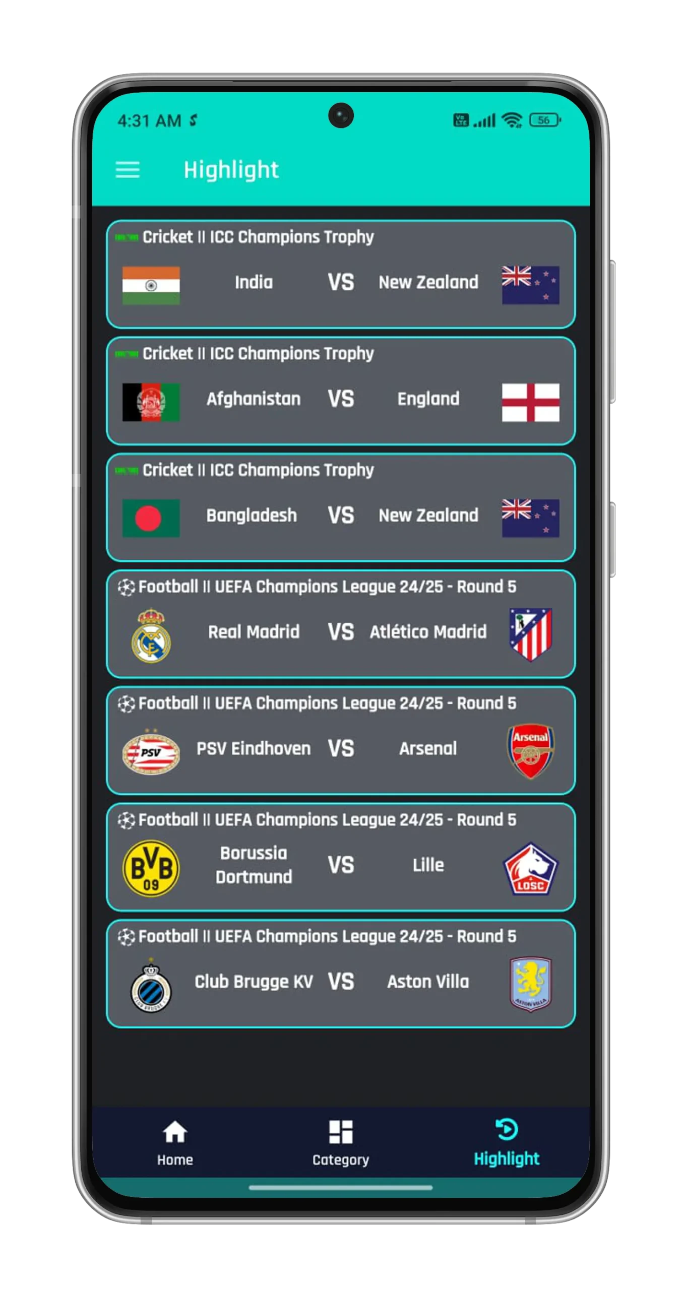 - Смотрите все виды спорта в прямом эфире: Вы можете смотреть футбол, баскетбол, UFC, крикет и крупные турниры, такие как АПЛ, IPL, Чемпионат мира T20, NBA, UEFA, NFL, … совершенно бесплатно прямо на вашем Android-устройстве с четким и плавным изображением.