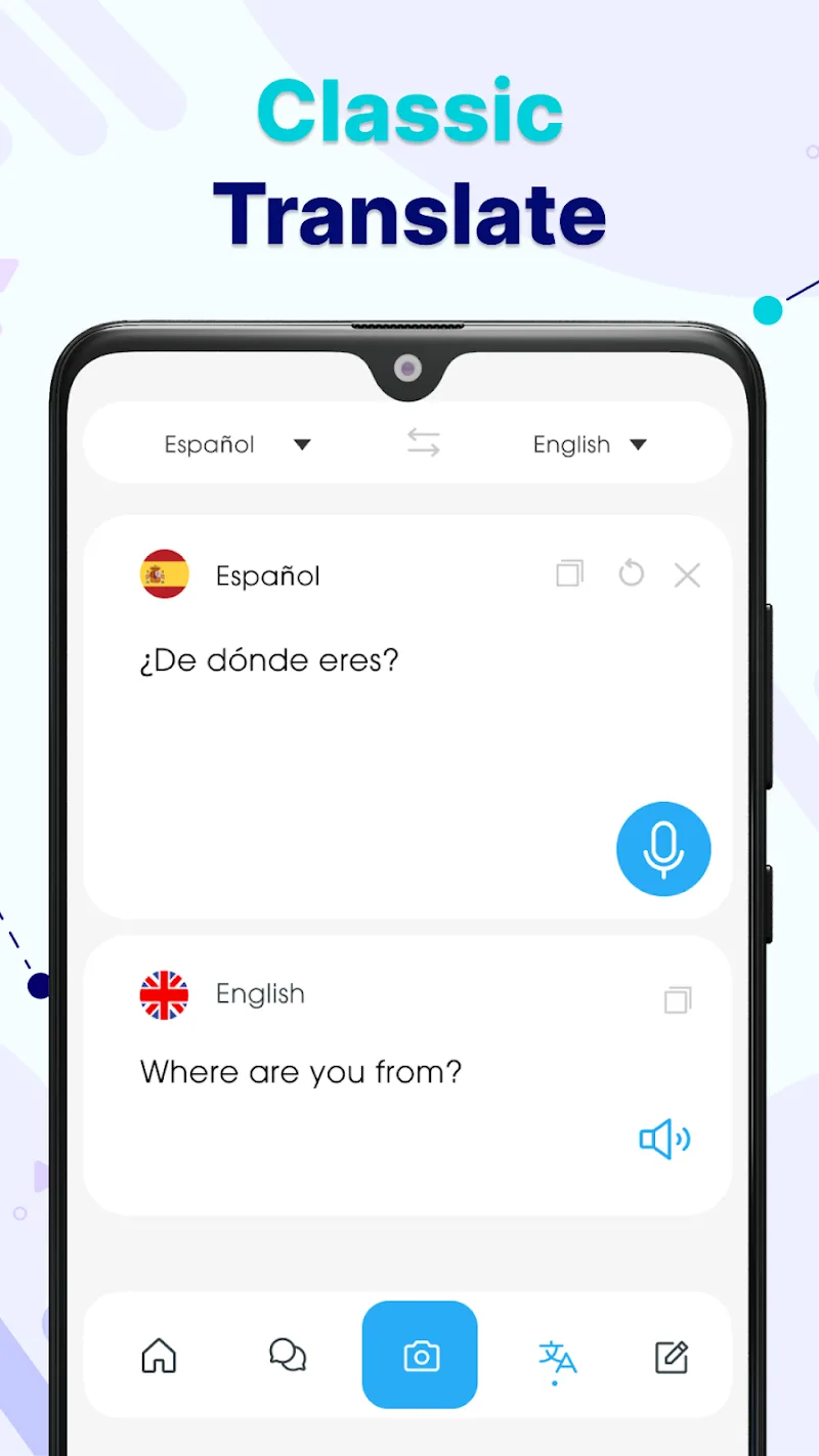 Языковые барьеры — самая большая проблема в человеческом общении. Translate App – AI Translator нашёл полезное решение для ускорения процесса перевода. Пользователи могут использовать инструмент перевода во многих различных формах. Приложение будет поддерживать пользователей в переводе по голосу и с помощью камеры.