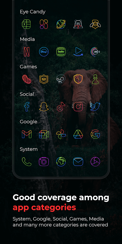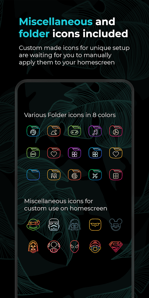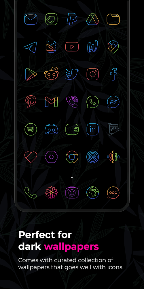 - Более 7 241 значка: Приложение часто придерживается простого стиля, создавая значки с характерными контурами. В то же время внутреннее пространство часто остаётся пустым, чтобы сохранить минимализм.